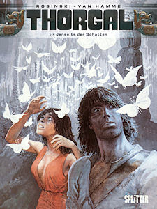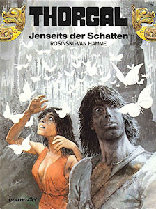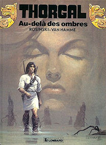 Suite de "La Galère noire". Un an de perdu... Pour la plupart des personnages de bande dessinée, le problème ne se pose même pas, car ils sont intemporels. Ils ne vieillissent pas, ne changent pas, et conservent souvent les mêmes vêtements (les crassous !). Quelques héros comme XIII ou Ric Hochet suivent l'évolution technique de leur temps, mais ils changent peu. Bien sûr, Thorgal n'a pas vieilli de 25 ans depuis sa création en 1976. Mais il a pris près de 15 ans dans la bouteille ! Ainsi qu'une femme, et deux enfants qui grandissent d'albums en albums. Du coup, la série n'est jamais si bonne que quand on lit les albums dans l'ordre. Un an de perdu... Ces bouts de vie gâchés sont une "spécialité" de Thorgal qui s'arrange pour tomber dans des mondes au temps décalé ("Presque le Paradis...", album 1) ou perdre la mémoire (saga de Shaïgan-sans-Merci, albums 18 à 23). Dans "Au-delà des Ombres", il perd la trace de son épouse et erre pendant un an. Il n'assiste donc pas à la naissance de son fils... Rosinski a dû bien s'amuser avec cet album ! On commence avec une ville crasseuse, pour enchaîner sur un sanctuaire de pierres dressées puis un marais désolé... qui aboutit dans une jungle luxuriante. Suivent un paradis fleuri et le vide cosmique, pour finir avec des grottes torturées, un exercice de style en noir et blanc surprenant. Une telle diversité de lieux dans un même album, il n'y a que dans un "Thorgal" que l'on peut voir ça ! La version allemande de l'album ("Jenseits der Schatten") a curieusement une couverture différente des autres, très réussie d'ailleurs. La voici en deux versions, l'ancienne numérotée 6 (l'album "L'enfant des étoiles" était le tome 1) et la nouvelle :