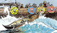 En tout cas, les boucliers sont des armes défensives courantes. Ceux des Vikings étaient généralement plats et circulaires, très différents du bouclier spectaculaire que veut Manthor. On en a retrouvé assez peu car ils étaient principalement en bois et en cuir, et n'ont pas résisté à l'usure des siècles ! Quelques boucliers ont été retrouvés dans des tombes (notamment les boucliers du navire de Gokstad en Norvège, un superbe navire de guerre enterré pour servir de chambre funéraire), d'autres dans des navires ayant coulé en eaux peu profondes, quelques-uns dans des boues marécageuses où ils furent emprisonnés. De nombreuses représentations nous sont également parvenues, gravures, sculptures, objets...