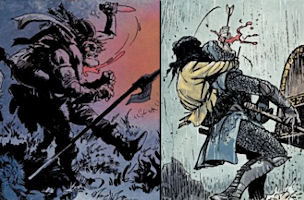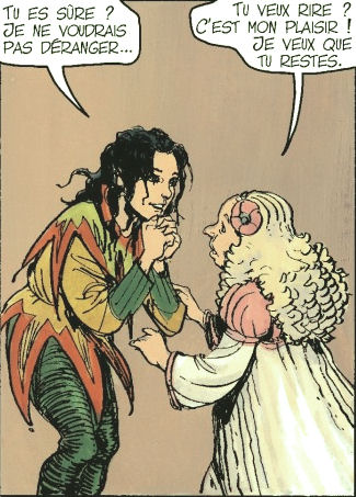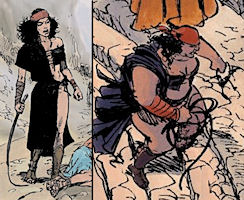 Autre star du casting, très attendue évidemment, Sigwald-le-brûlé, dont l'histoire dramatique occupe la deuxième moitié de l'album. "Je n'oublie rien" est presque autant l'album de sa vie que de celle de Kriss. Sigwald est le personnage parfait pour un album de ce type car Van Hamme n'avait qu'ébauché son personnage, en le supprimant très vite, tout en lui donnant une personnalité et un physique uniques. C'était la force de Van Hamme : faire beaucoup avec peu, donner des pistes au lecteur sans forcément l'emmener au bout. Yves Sente s'est engouffré dans l'espace laissé par son prédécesseur en donnant à Sigwald un passé, un visage et un coeur. Il sera intéressant, dans le prochain album, de voir quelle influence il aura sur Kriss et d'imaginer la vie qu'aurait connue la jeune femme si son ami n'avait pas disparu si tôt... On peut également noter de multiples clins d'oeil concernant Kriss plus directement. Le premier est sa maladresse d'enfant à la fronde, elle qui deviendra une archère si habile ! On est ainsi tout de suite en terrain familier, dès la première page, cette enfant brune qui tire sur tout ce qui bouge, c'est bien Kriss ! Plus loin dans l'album, sa première scène de combat, son premier corps à corps, est un hommage sanglant à son premier combat dans la série, dans l'album "Les archers". Une danse mortelle où la fureur et l'agilité l'emportent sur la force brute. Même si c'est de manière peu orthodoxe, Kriss utilise pour se battre ce qui deviendra son arme favorite, la flèche. Les personnages secondaires se prêtent aussi au jeu du clin d'oeil, notamment au cours de l'une des scènes finales. Le jeu pervers d'Opale rappelle évidemment celui d'Héraclius dans "Le barbare", tandis que la tenue "particulière" de Gorgane a manifestement fortement inspiré Kriss lorsqu'elle est devenue chef d'équipe dans les mines d'argent byzantines, dans l'album "Kriss de Valnor".