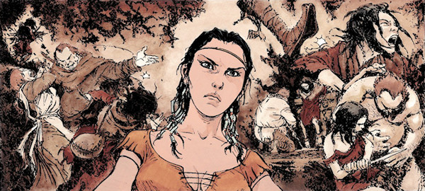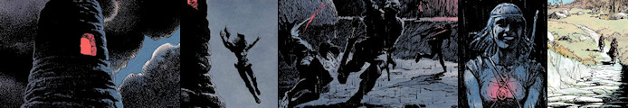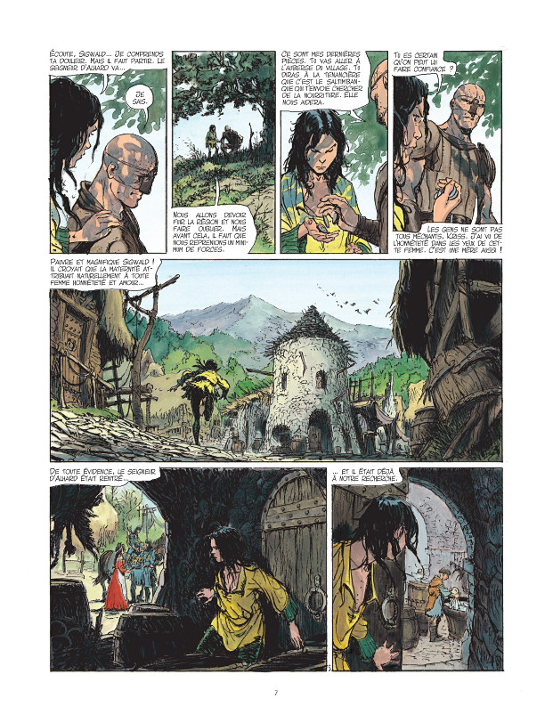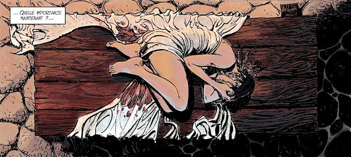 Est-elle un monstre ? Comment la qualifier au coeur de la barbarie qu'elle traverse ? Elle subit ou fait subir tout ce qu'il y a de pire au répertoire de l'être humain, jusqu'à effleurer le suicide ou l'automutilation, solutions finales heureusement rejetées par Sigwald, même si l'avortement qu'elle choisit, tout aussi douloureux, n'est en rien réconfortant. Les scènes fortes, déchirantes, potentiellement choquantes sont nombreuses et destinent cet album à un public averti. On peut citer l'avortement donc, et la Calédonienne sortant de la tour avec son petit fardeau sanglant dans la main. Il y a aussi le massacre dans le village, suivi du viol, deux scènes terribles au cadrage choisi et à l'encrage épais, noir, presque visqueux. Il y a cet enfant, qu'on force à assassiner son seigneur pour sauver la vie de sa mère. Et cette scène dérangeante où Kriss répand sa haine dans le village, laissant entendre que les enfants de Welgrund y sont les fragiles victimes des pulsions malsaines de leurs propres parents... Brrrr... Quelle haine, quelle noirceur, quel pamphlet contre une humanité dégénérée, misérable et crasseuse. Une saleté partiellement nettoyée par la pluie et le feu, dans une scène finale à Welgrund où le dessin, accompagné par les couleurs de la coloriste Graza, distille fort bien ce besoin de se purifier le corps et l'âme, ressenti par la jeune fille et, à travers elle, par le lecteur.