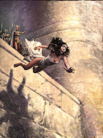 Cette planche interactive permet d'apprécier l'étape de colorisation des planches. Comme pour les autres albums des Mondes de Thorgal, c'est la coloriste polonaise Graza, déjà à l'oeuvre sur la série principale dans les années 90, qui a mis en couleurs les planches. Ci-dessous, vous pouvez recouvrir le bleu de coloriage avec l'encrage de Giulio de Vita. Déplacez la souris de gauche à droite sur la planche. Marginaux mais solidaires, Kriss et Sigwald parcourent le pays en proposant leurs talents de saltimbanques. Sigwald fait de Kriss une archère hors pair.