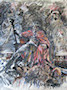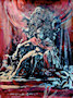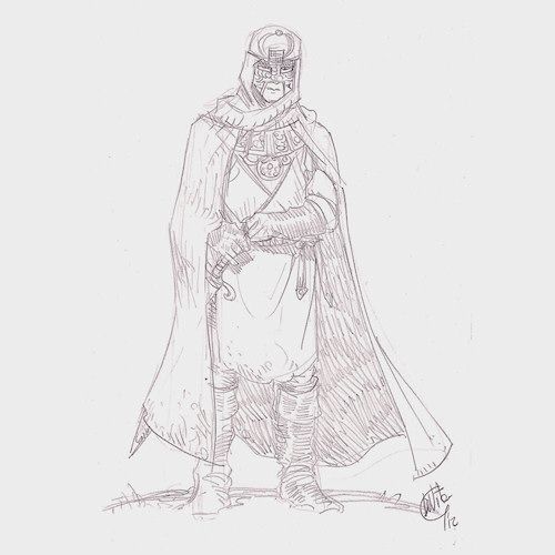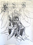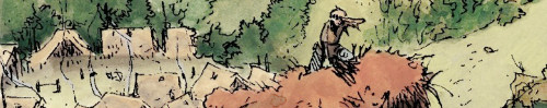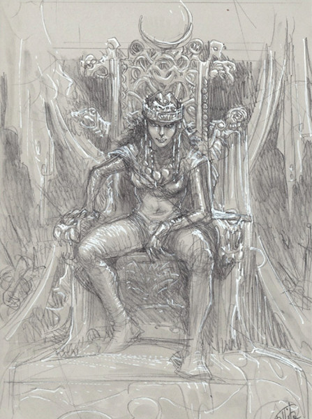 Voici différentes étapes de la réalisation de la couverture de cet album. La première image est une proposition de couverture réalisée par Giulio de Vita. L'auteur italien en a dessiné plusieurs, comme pour les albums précédents, et Rosinski a choisi sa préférée. La 1ère étape est une série de croquis esquissés rapidement sur une grande feuille blanche, avec les grandes lignes de la composition de l'image.