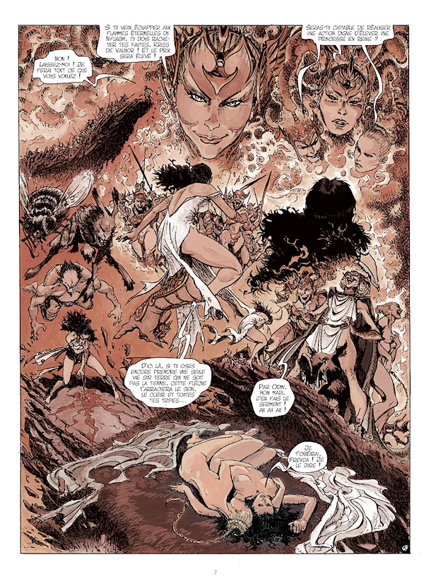 L'intrigue de cet album devient du coup évidemment politique. Les adversaires se jaugent, menacent et complotent, en se rendant coup pour coup. Le jeu politique est bien mené avec des références assumées à Tintin et son sceptre d'Ottokar, d'autant qu'en parallèle Kriss mène une enquête digne d'un journaliste aventurier. Elle doit ramener un sceptre, son temps est limité, ses ennemis sont au coeur du royaume, auprès du roi, et le pays voisin n'attend que cette occasion pour s'emparer du pouvoir. Et comme pour Tintin, c'est finalement un allié providentiel qui lui offre la clé de la réussite, Fhropor remplaçant Milou. La fin de l'album est par contre bien différente, Kriss n'est pas Tintin ! D'autant que la disparition d'Hildebrün et de la malédiction des Walkyries l'autorise à reprendre le contrôle de sa vie et de ses actes. A suivre dans "Alliances". Voici cinq planches extraites de "Digne d'une reine". Ce sont les pages 7 à 11 de l'album. Après avoir été jugée par le tribunal des Walkyries, Kriss de Valnor s'est réveillée au côté de la belle Hildebrün. Une alliée qui lui offre un accueil particulièrement chaleureux.