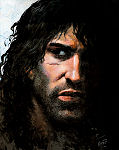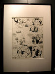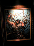 Les commentaires sont plus qu'élogieux, les visiteurs sont ravis, même ceux qui découvrent Thorgal. Je croise à nouveau Grzegorz Rosinski, qui reste quelques minutes. Sur la droite de l'expo, quelques bancs font face à un téléviseur diffusant un court documentaire (présent dans le second BDVD, "Dans les griffes de Kriss"). On y voit Rosinski réaliser la magnifique peinture qui sert de couverture au BDVD. La toile est exposée juste à côté, immense et superbe. Ce pas à pas artistique, mis en musique, est passionnant. Quoi d'autre ? D'autres peintures, pour la plupart des couvertures d'albums. Celle des "trois Vieillards du Pays d'Aran" mesure 30 cm, celle de "Moi, Jolan" environ 1 m ! On a aussi la fameuse statuette d'Attakus représentant la Kriss de Valnor de l'album éponyme (589 euros dans les boutiques...). Il y a d'autres sculptures en bois, des arcs et flèches, des objets anciens. Ici et là sont proposés des albums de Thorgal reliés par un filin anti-fauche à des vitrines contenant des portraits des héros, des recherches de personnages, des esquisses, des objets. Il y a même un petit carnet auquel peu de gens semblent prêter attention... On y trouve pourtant le story-board complet de "Moi, Jolan" ! Cerise sur le gâteau, tout au fond de l'expo, un magnifique pastel nous propose Thorgal et Aaricia tel qu'on les a rarement (jamais ?) vus, étourdis dans une étreinte amoureuse très sensuelle. Aaricia y est plus belle que jamais. Dans l'entrée de la salle, mon Aaricia et mon Jolan m'attendent. Un dernier regard... Merci Saint-Malo, au revoir. » (expo réalisée par Alain Goutal, Fred Lecaux, Darwin,Romain Guyard, Dieter, Diane Rayer et Piotr Rosinski, pour Quai des Bulles, Le Lombard et la ville de Saint-Malo) |