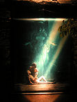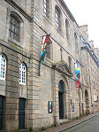 Facilement garés, nous pénétrons dans l'Intra-Muros, quartier cerné par des remparts, près du port. C'est le lieu magique de la ville, presque entièrement reconstruit après les bombardements destructeurs de la deuxième guerre mondiale. L'impression y est curieuse car les rues pavées et les bâtiments ont été reconstruits "à l'ancienne". Pierres en façades, ardoises sur les toits, style préservé. Peu de bois par contre, la ville a semble-t-il connu de gros incendies. Une ville moyenâgeuse toute neuve... Saint-Malo accueille Thorgal et le fait savoir ! Une immense affiche couvre une partie de la tour qui nous accueille à l'entrée des remparts. Le ton est donné. L'expo est à la chapelle Saint-Sauveur... Nous partons en chasse, certains qu'un Malouin bienveillant nous guidera jusqu'à elle. Et notre guide s'appelle... Thorgal ! Des banderoles à la gloire du viking et de son expo balisent les rues de la ville, aidées par des affichettes fixées un peu partout. Trop facile, mais finalement assez excitant. On suit... La chapelle, qui fait face à une école, est aussi habillée de Thorgal. Je ne m'attarde pas à la contempler, tant pis pour elle. J'entre... Le lieu est sombre, la musique discrète. Des tentures blanches et kaki couvrent élégamment les murs et plafonds de l'immense salle. Des panneaux noirs sont disposés de façon à créer un labyrinthe ponctué d'alcôves. Sur ces panneaux, multiples puits de lumière, les oeuvres de Rosinski sont là. Thorgal nous accueille dans son univers. C'est beau.