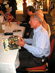 Je m'approche, déjà sûr de ce qui est au fond de la salle. Ils sont là... Tous les trois, de gauche à droite Yves Sente, Grzegorz Rosinski et Jean Van Hamme, assis derrière une table ! Ma première pensée est pour l'attachée de presse du festival que j'ai contactée au téléphone quelques jours auparavant, et qui m'a carrément affirmé que les auteurs ne rencontreraient pas leur public... Preuve que, comme souvent, la source la plus directe n'est pas la meilleure, ni la plus fiable. Ils sont donc là... Avec deux bras, deux jambes, des cheveux et tout. Si si, on dirait presque des vrais gens ! Comme ils semblent très disponibles, je m'installe près d'eux, prend quelques photos pour le site, écoute les conversations. Les trois gars signent à tour de bras, des albums et des ex-libris. On leur sert un petit canon, ils dessinent sur la table, Van Hamme trace des rébus salaces. En discutant avec des bénévoles, j'apprends qu'une autre séance sera proposée le dimanche de 17 h à 19 h. Parfait !